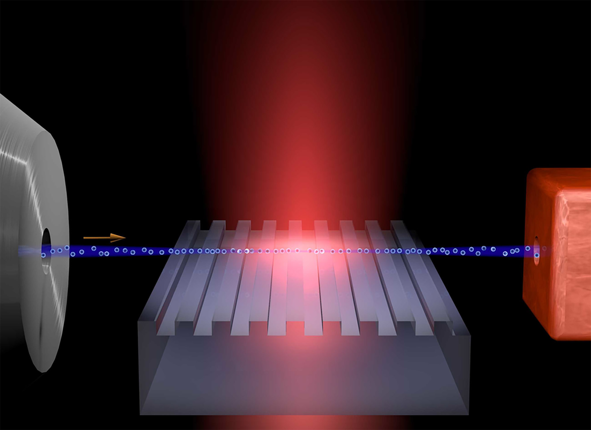 Electrons are accelerated by a laser field above a grating structure on a chip.